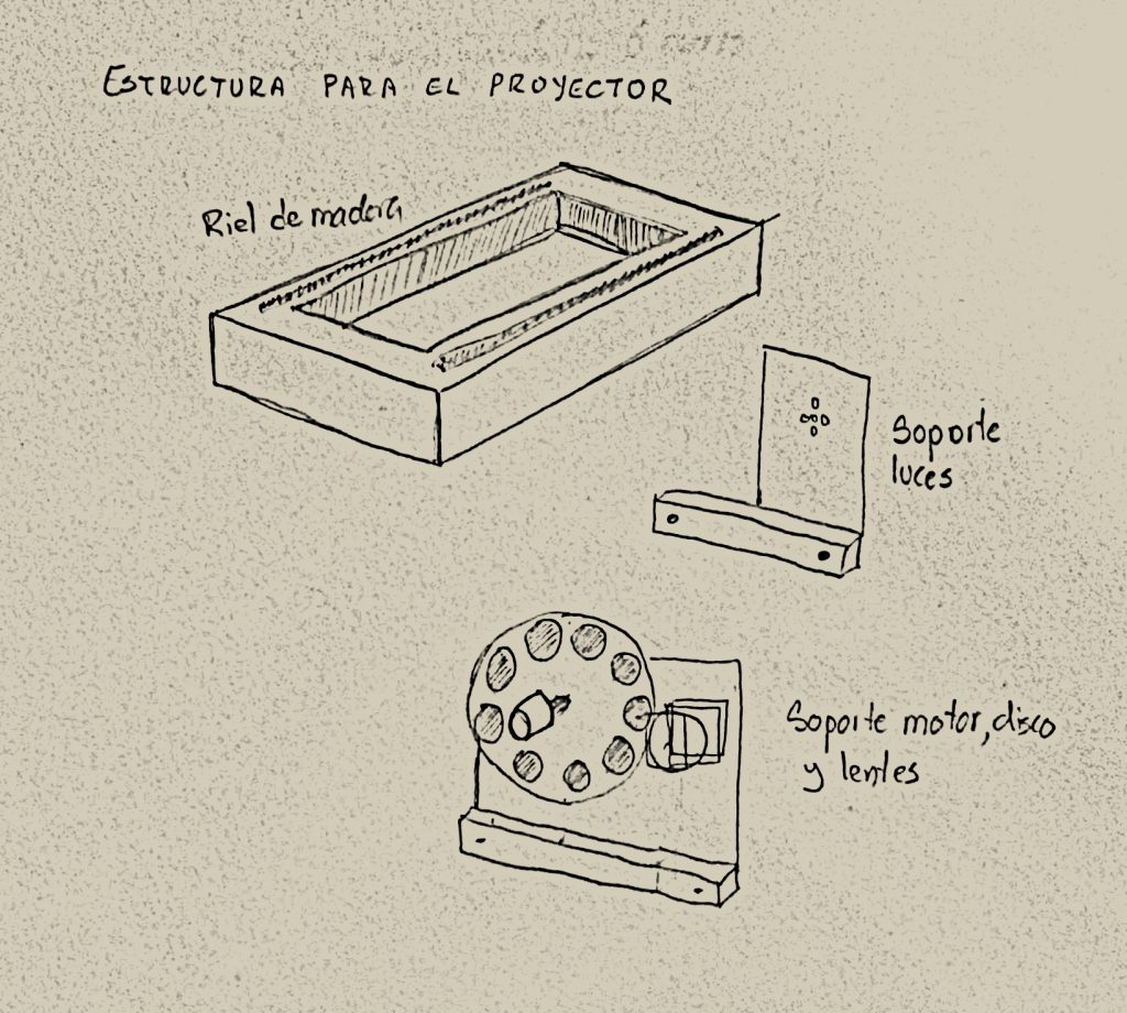 Se construyó un soporte en madera con un riel, que permitiera ajustar la distancia entre elementos con el fin de ajustar el foco de la proyección, de acuerdo a la distancia de la superficie de proyección