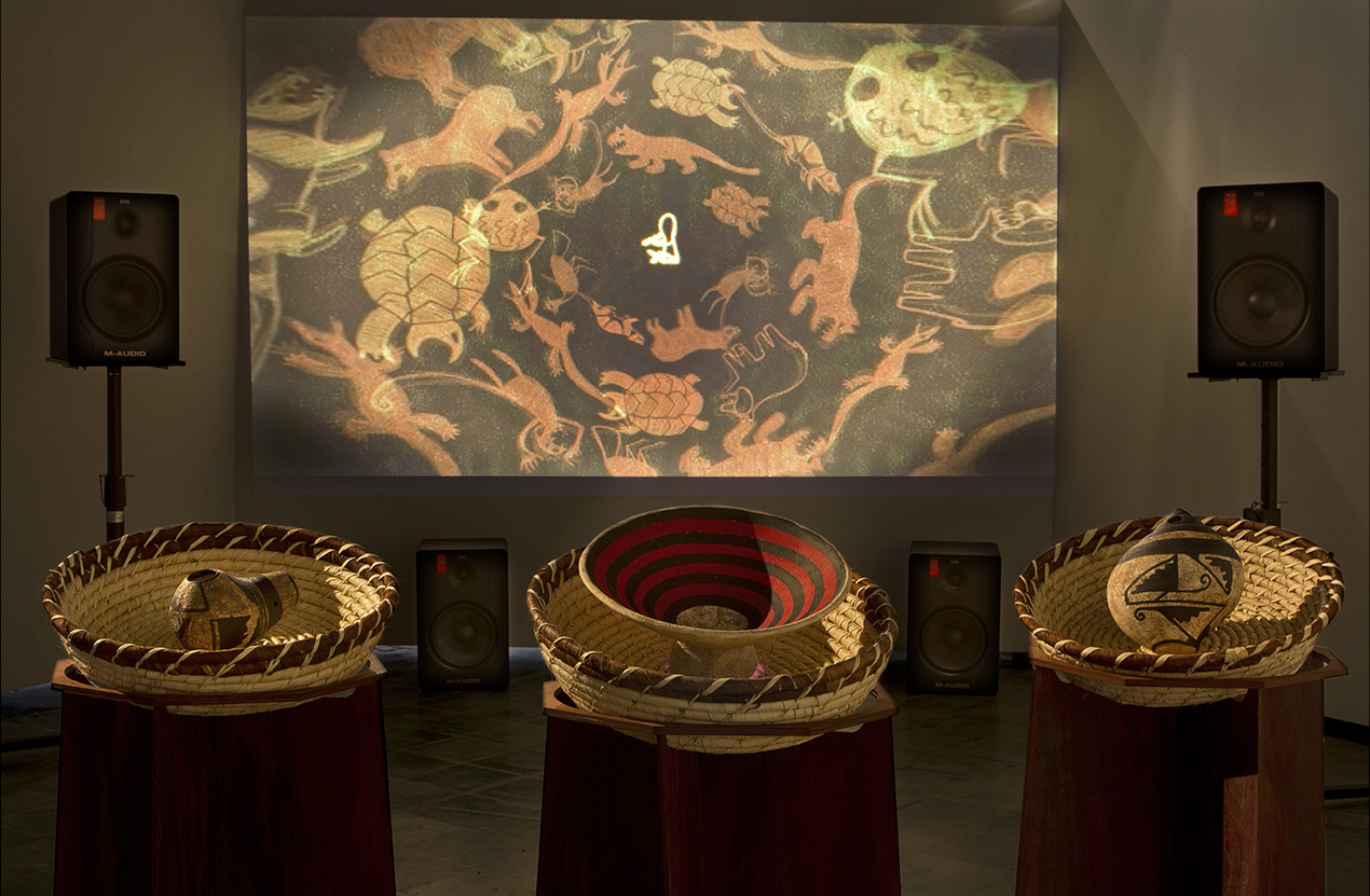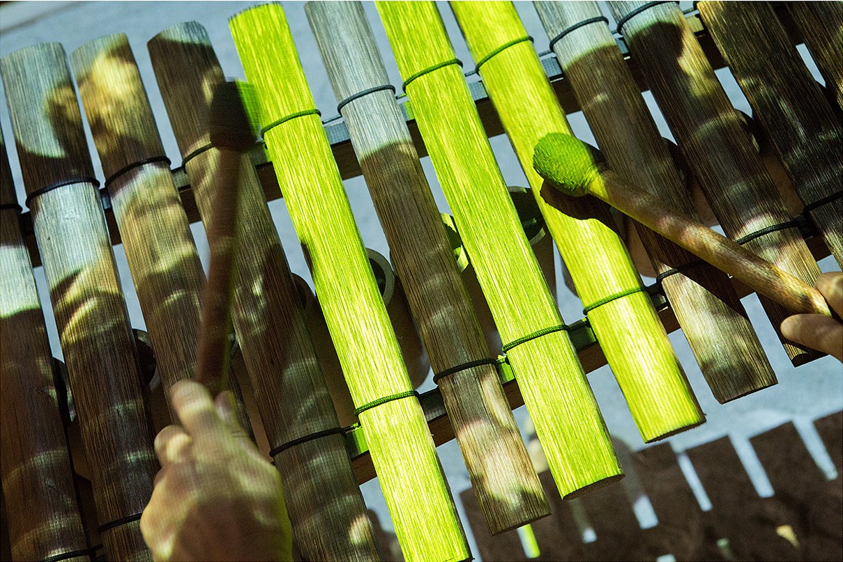 Esta instalación propone una expansión visual de la marimba de chonta en la que la ejecución del instrumento remite a prácticas culturales de una comunidad del pacífico colombiano.