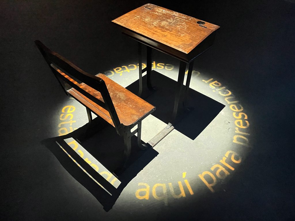 Un antiguo pupitre de madera, símbolo de la disciplina escolar, se convierte en una interfaz que activa elementos visuales y sonoros sobre las manifestaciones sociales durante el Paro Nacional en Colombia en 2021