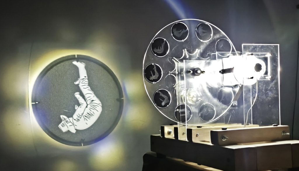 Este dispositivo análogo, de proyección de imagen animada, presenta la figura de un campesino, un raspachín de coca, en un ciclo continuo y repetitivo de caída, que, visto de manera invertida, esconde el gesto de raspar las hojas de la planta.